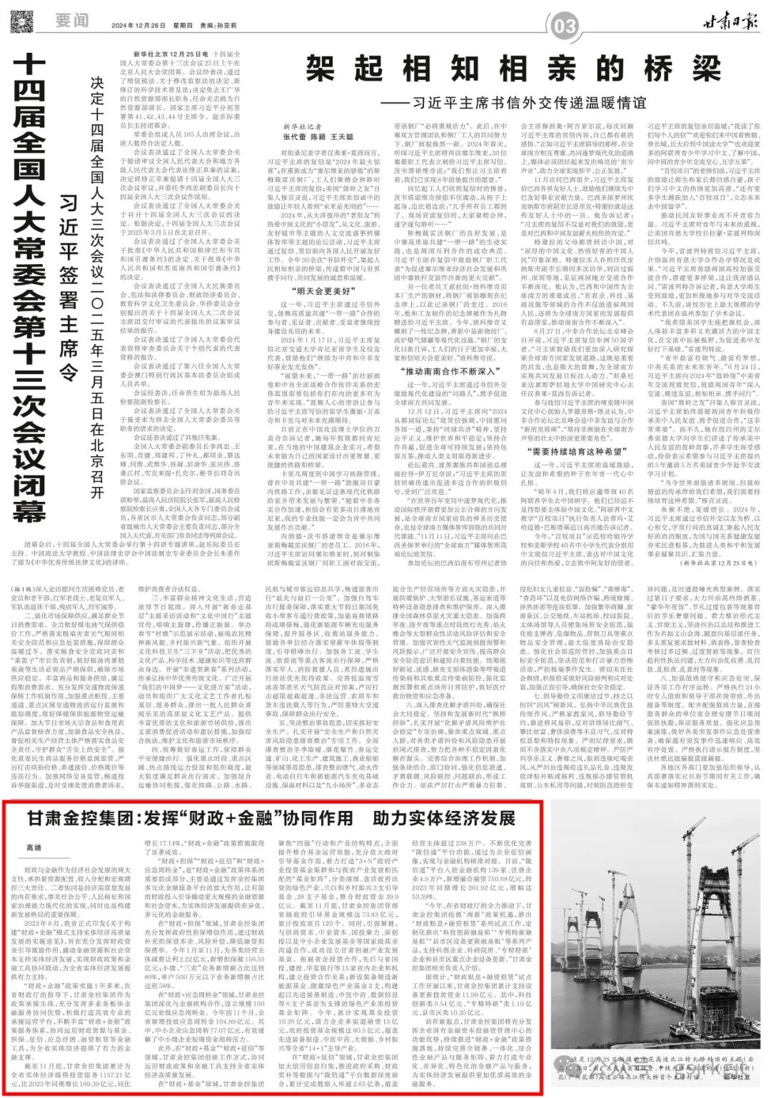此外,在“財政+基金”“財政+征信”等領(lǐng)域,甘肅金控集團創(chuàng)新工作方式,協(xié)同運用財政政策和金融工具支持全省實體經(jīng)濟高質(zhì)量發(fā)展。