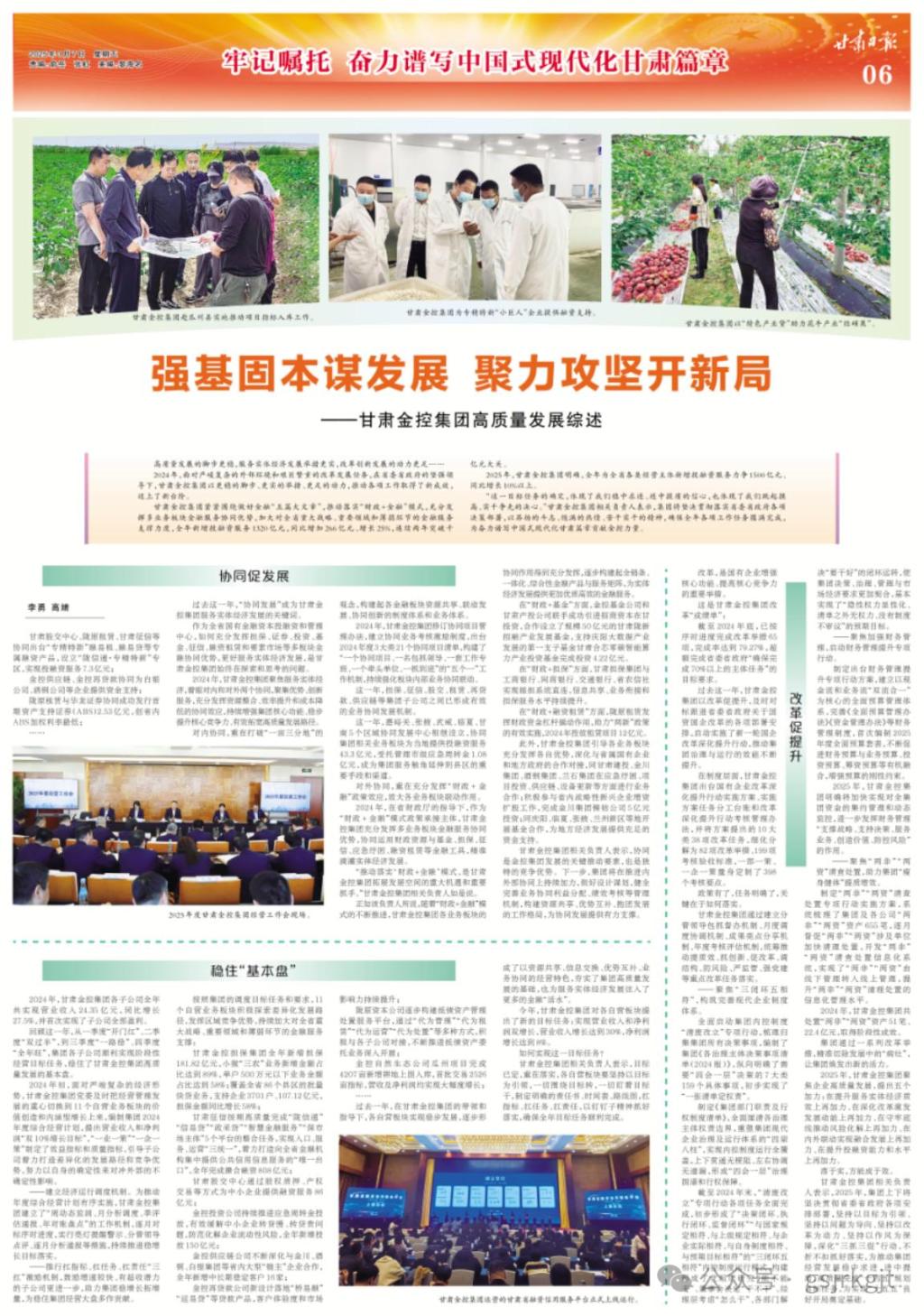 2025年,甘肅金控集團聚焦企業(yè)高質量發(fā)展,提出五個加力:在提升服務實體經濟質效上再加力、在深化改革激發(fā)發(fā)展動能上再加力、在守牢底線推動風險化解上再加力、在內外聯(lián)動實現(xiàn)融合發(fā)展上再加力、在提升投融資能力和水平上再加力。