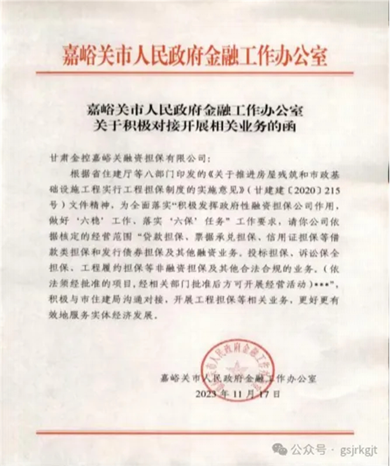 金控嘉峪關擔保公司通過開展履約保函等工程擔保業(yè)務,在助力強化建筑領域風險管理和建立健全建筑市場誠信機制中充分發(fā)揮政府性融資擔保機構職能,為更好服務地方實體經(jīng)濟發(fā)展努力貢獻自身力量。