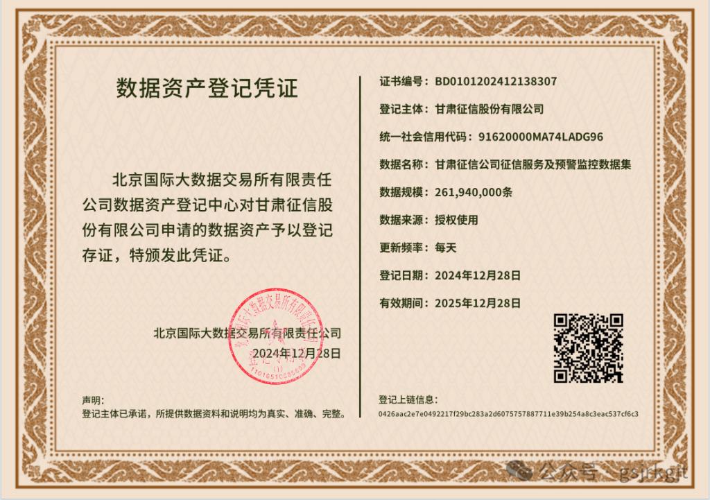 近日,甘肅征信成功完成首單數(shù)據(jù)資產(chǎn)入表工作?!案拭C征信公司征信服務及預警監(jiān)控數(shù)據(jù)集” 數(shù)據(jù)產(chǎn)品順利通過北京國際大數(shù)據(jù)交易所審核公示,取得數(shù)據(jù)資產(chǎn)登記憑證(證書編號:BD0101202412138307),成為甘肅省省內(nèi)首例以征信數(shù)據(jù)實現(xiàn)數(shù)據(jù)資產(chǎn)入表的省屬國有企業(yè)。