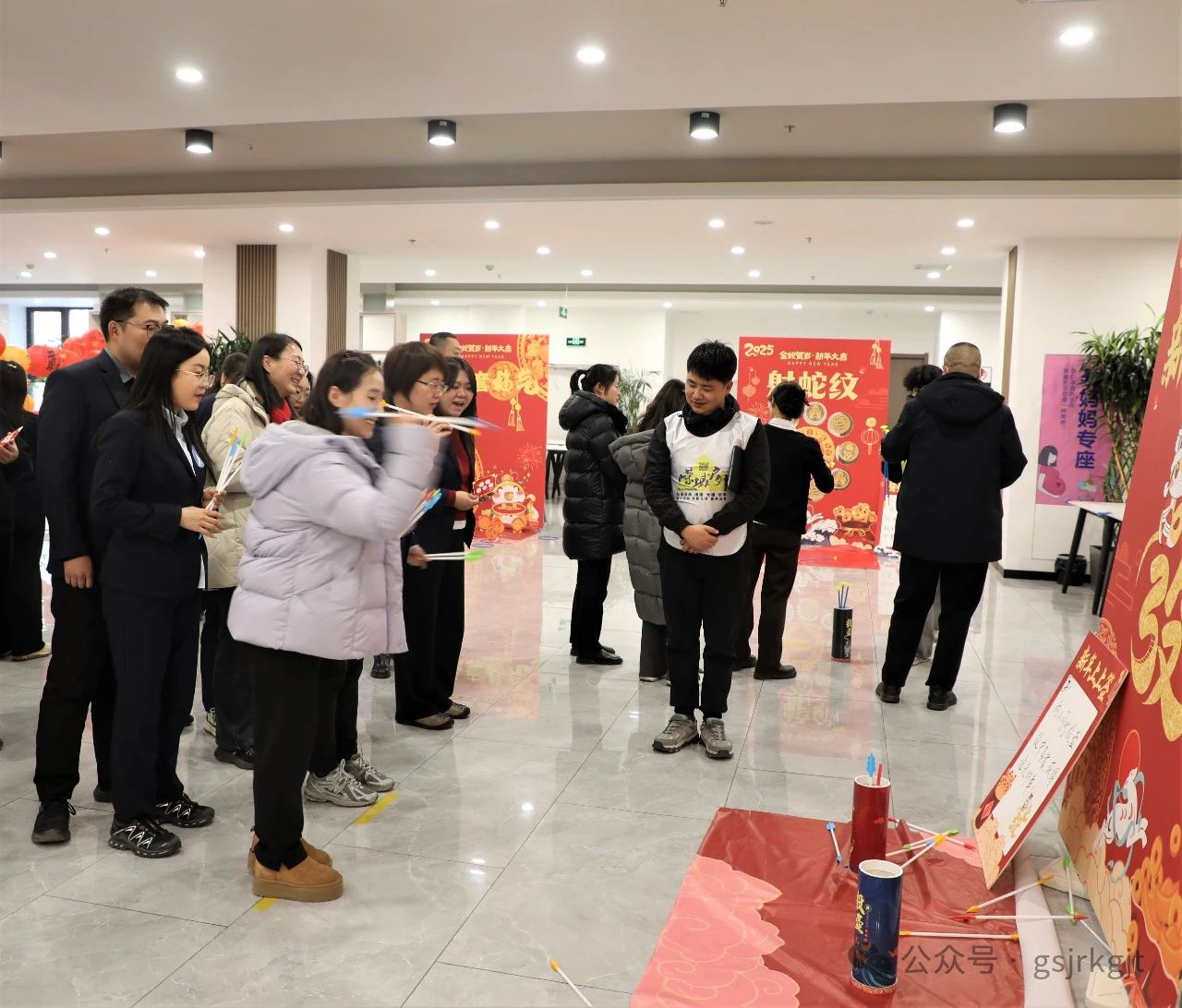 隨著鏗鏘有力的鑼鼓聲,兩只威武靈動的“祥瑞金獅”躍入會場,拉開活動序幕,在舞獅隊員輾轉(zhuǎn)騰挪間,集團公司領(lǐng)導執(zhí)筆點睛,寓意新年開新局。隨后開展的“古韻新潮”游戲區(qū)人聲鼎沸,投壺游戲中的“上上簽”破空聲與歡呼聲此起彼伏,“射箭”靶場選手凝神靜氣“百步穿楊”,“釣魚”現(xiàn)場錦鱗翻飛笑鬧如潮,套圈環(huán)節(jié)精準拋擲歡呼雀躍,冰壺賽道上更是上演“智謀對決”,團隊協(xié)作的默契充分展現(xiàn)?,F(xiàn)場氣氛熱烈,歡笑與掌聲交織出歡樂的海洋。