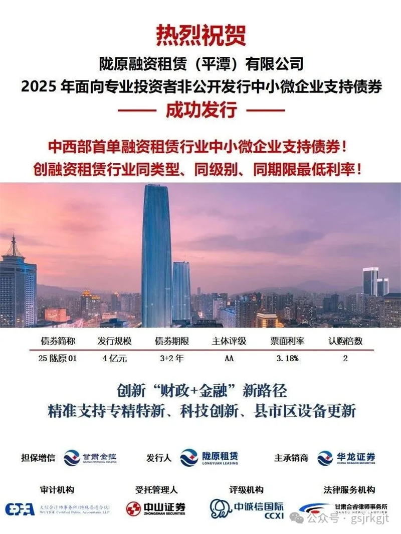 隴原租賃充分依托甘肅金控集團(tuán)“財(cái)政+金融”模式優(yōu)勢,以財(cái)政政策引導(dǎo)、金融服務(wù)協(xié)同、投融資聯(lián)動等方式,吸引資本市場資金全力支持我省實(shí)體經(jīng)濟(jì)。7月28日,隴原租賃在上交所成功發(fā)行中小微企業(yè)支持債券,規(guī)模4億元,期限3+2年,票面利率3.18%,認(rèn)購倍數(shù)2倍,是中西部省份首單融資租賃行業(yè)中小微企業(yè)支持債券,創(chuàng)融資租賃行業(yè)同類型、同級別、同期限歷史最低利率。