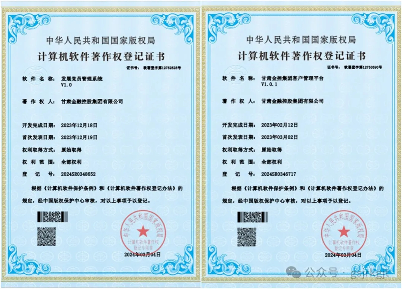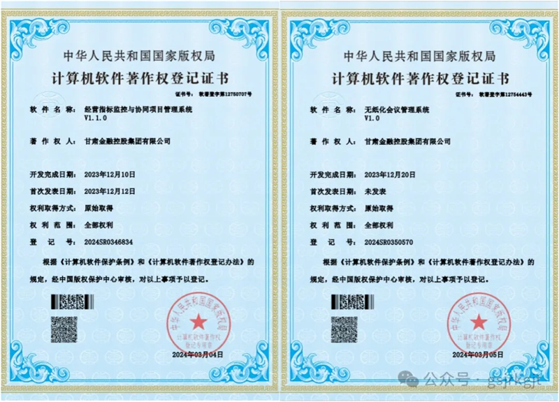 近日,甘肅金控集團(tuán)獲得“無紙化會(huì)議管理系統(tǒng)”、“客戶管理平臺”、“經(jīng)營指標(biāo)監(jiān)控與協(xié)同項(xiàng)目管理系統(tǒng)”和“發(fā)展黨員管理系統(tǒng)”四項(xiàng)計(jì)算機(jī)軟件著作權(quán)登記證書。本次獲得證書的軟件系統(tǒng)是集團(tuán)在行政辦公、經(jīng)營管理和黨建信息化建設(shè)方面的最新成果,標(biāo)志著集團(tuán)信息技術(shù)能力邁上新臺階。