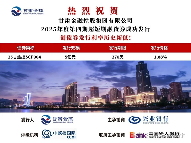 2025年6月26日,甘肅金控集團(tuán)成功發(fā)行2025年度第四期超短期融資券“25甘金控SCP004”,規(guī)模5億元,期限270日,票面利率1.88%,創(chuàng)集團(tuán)債券發(fā)行利率歷史新低,有助于集團(tuán)降低融資成本。