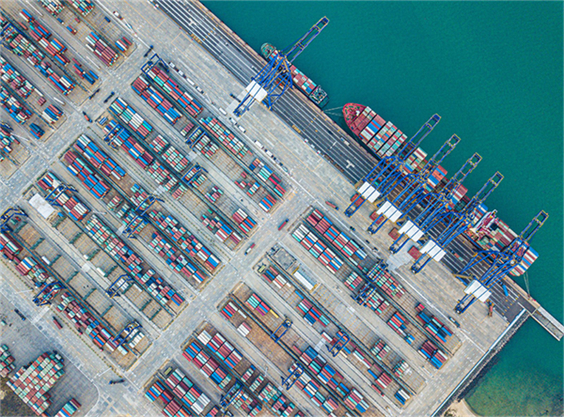 在海南環(huán)新英灣地區(qū)拍攝的洋浦國(guó)際集裝箱碼頭(無(wú)人機(jī)照片,2月28日)。新華社記者 蒲曉旭 攝