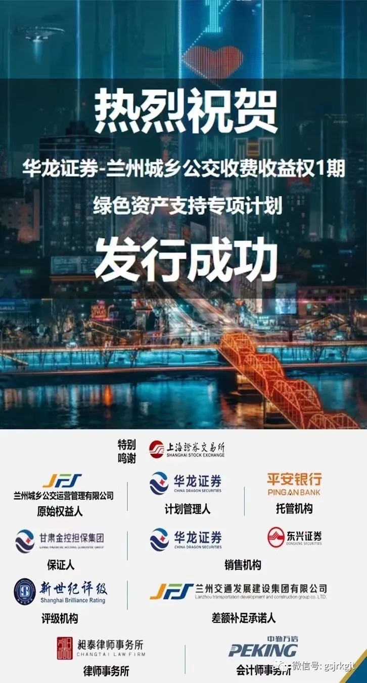 日前,由金控?fù)?dān)保作為保證人、華龍證券擔(dān)任計劃管理人的“蘭州城鄉(xiāng)公交收費收益權(quán)1期綠色資產(chǎn)支持專項計劃”成功發(fā)行,這也是甘肅首單綠色資產(chǎn)支持專項計劃。