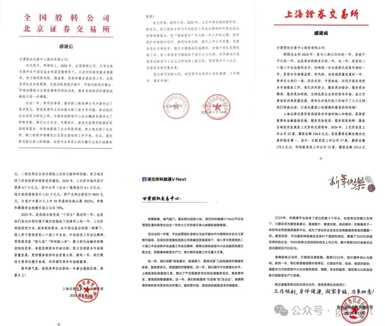 近日,甘肅股權(quán)交易中心收到北京證券交易所和全國股轉(zhuǎn)公司、上海證券交易所、深圳證券信息有限公司感謝信,對甘肅股權(quán)交易中心過去一年給予的支持表示感謝,同時希望未來進(jìn)一步加強(qiáng)合作交流,凝聚合力服務(wù)實體經(jīng)濟(jì)高質(zhì)量發(fā)展。